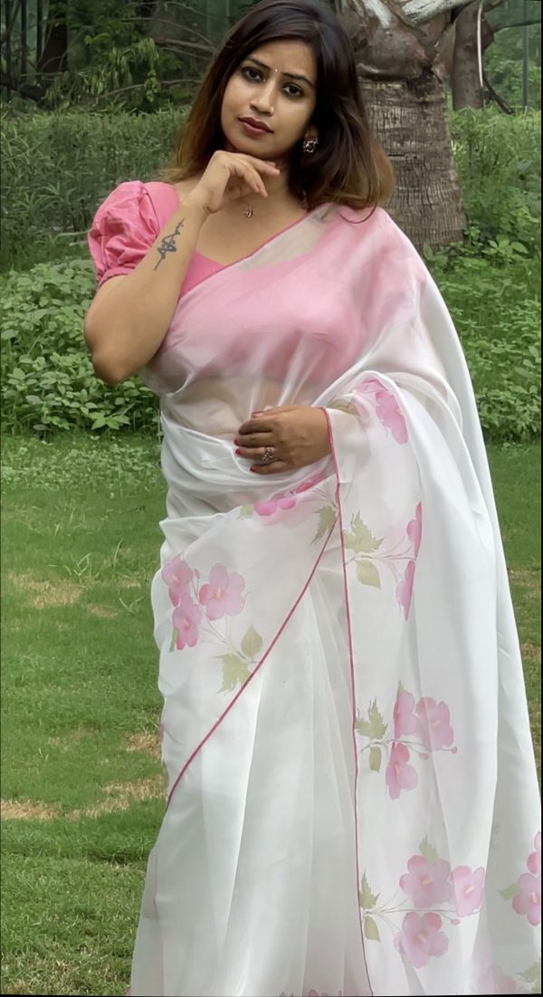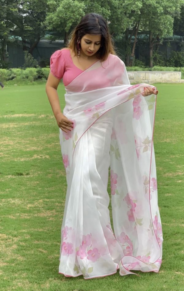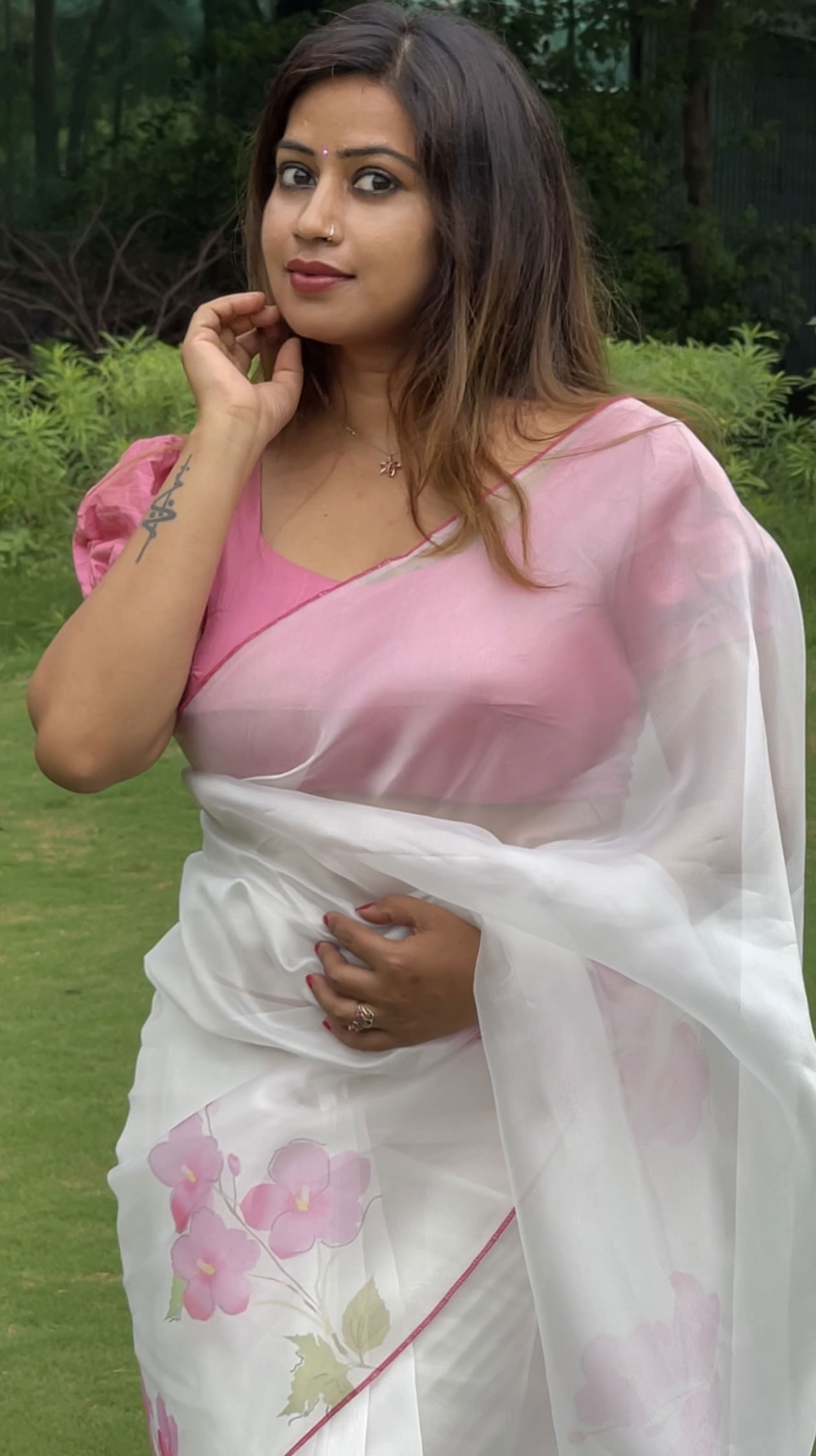 The soft pink organza saree adorned with delicate pink flowers radiates grace and allure. Constructed from a lightweight organza fabric, the saree drapes with effortless elegance, enhanced by the intricate pink floral embroidery that imparts a sense of refinement. This refined piece effortlessly blends subtlety and femininity, making it an ideal selection for special occasions and celebrations.