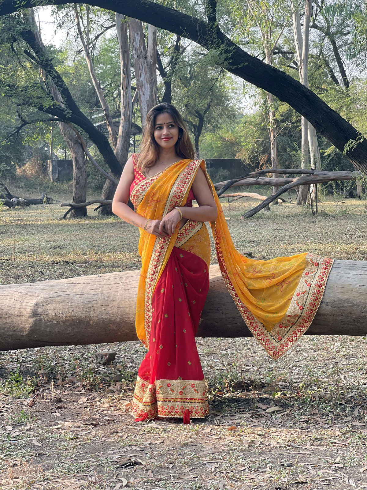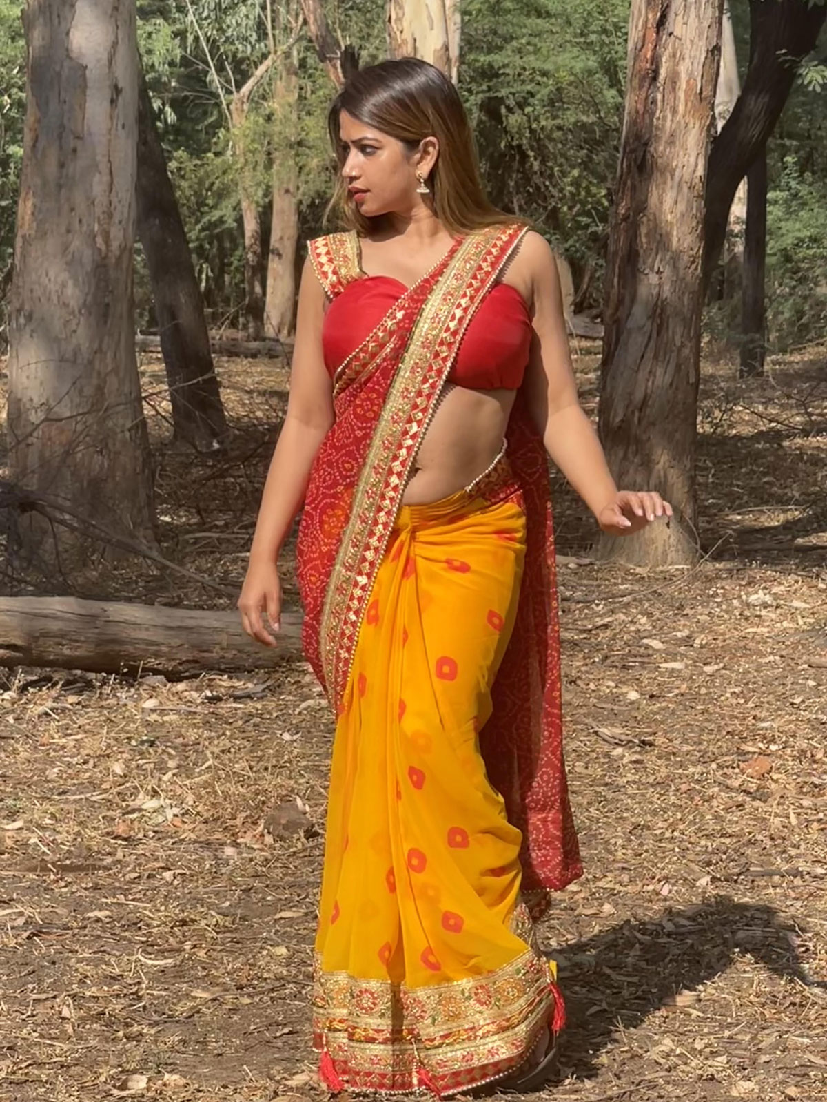 The yellow and red bandhani saree features intricate heavy border work, adding a touch of opulence to its vibrant design. The traditional bandhani tie-dye technique creates a mesmerizing pattern on the fabric. The rich combination of yellow and red hues, coupled with the elaborate border work, makes