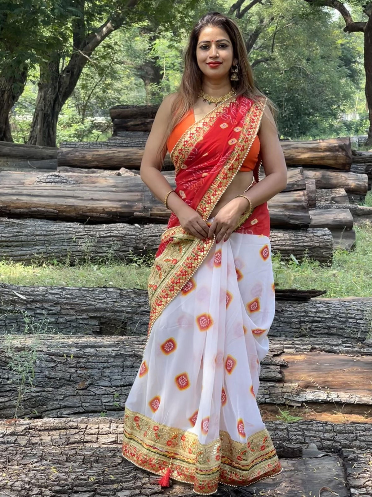 Red white bandhani saree