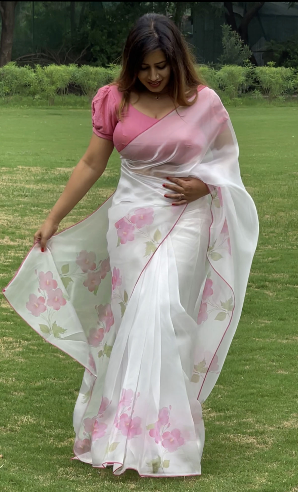 Lite pink organza saree with pink flowers